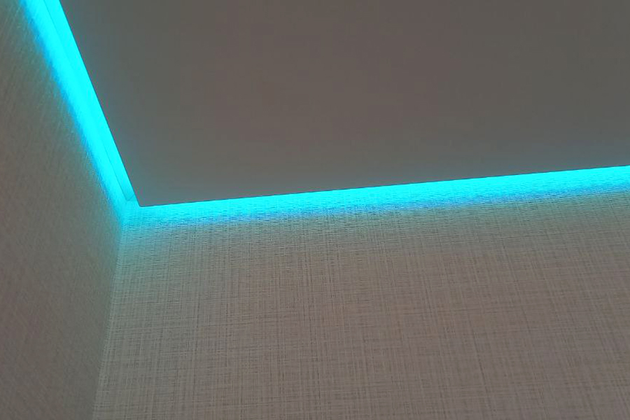 Контурные натяжные потолки отличаются от парящей системы тем, что светодиодная лента светит не из ниши между стеной и потолком, а из-под самого потолка, образуя его контур. При выключении подсветки смотрится как обычный натяжной потолок. Внимание! Для установки контурного потолка стены должны быть ровными!
